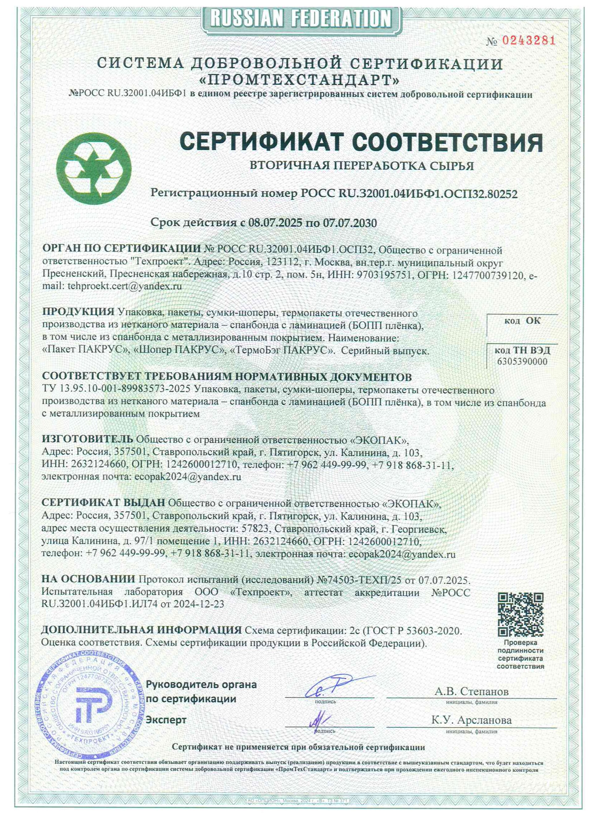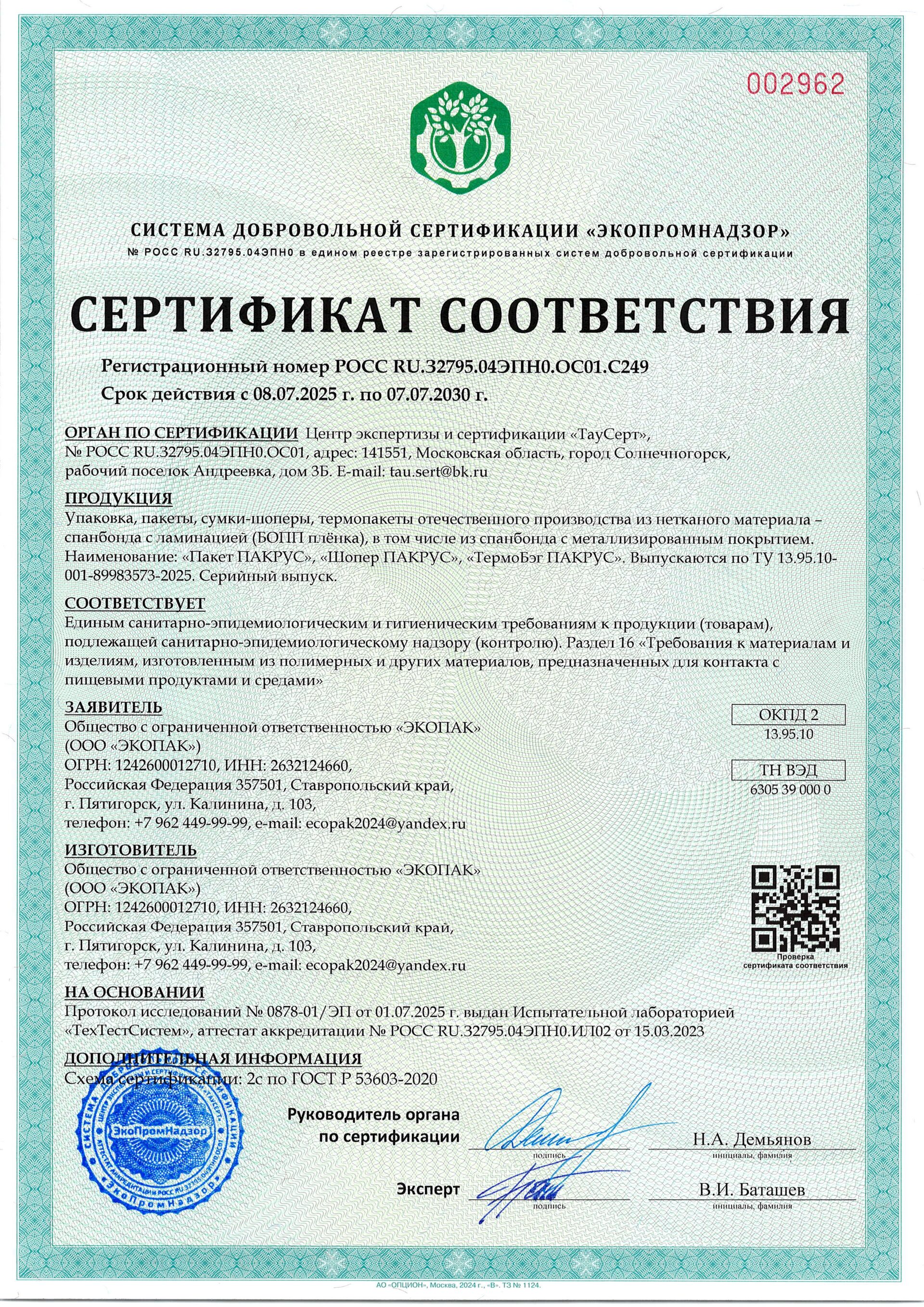 Основной вид продукции сегодня – это экологичные пакеты, шоперы, термо-пакеты для пищевых продуктов и напитков.